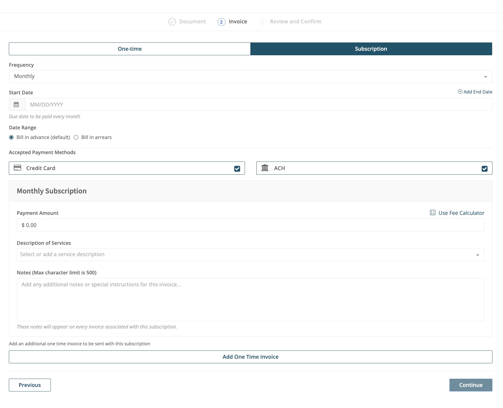 8. If notes are allowed/enabled at the firm level, Advisors can add notes to the invoice or subscription that are visible to their client. Next click Continue