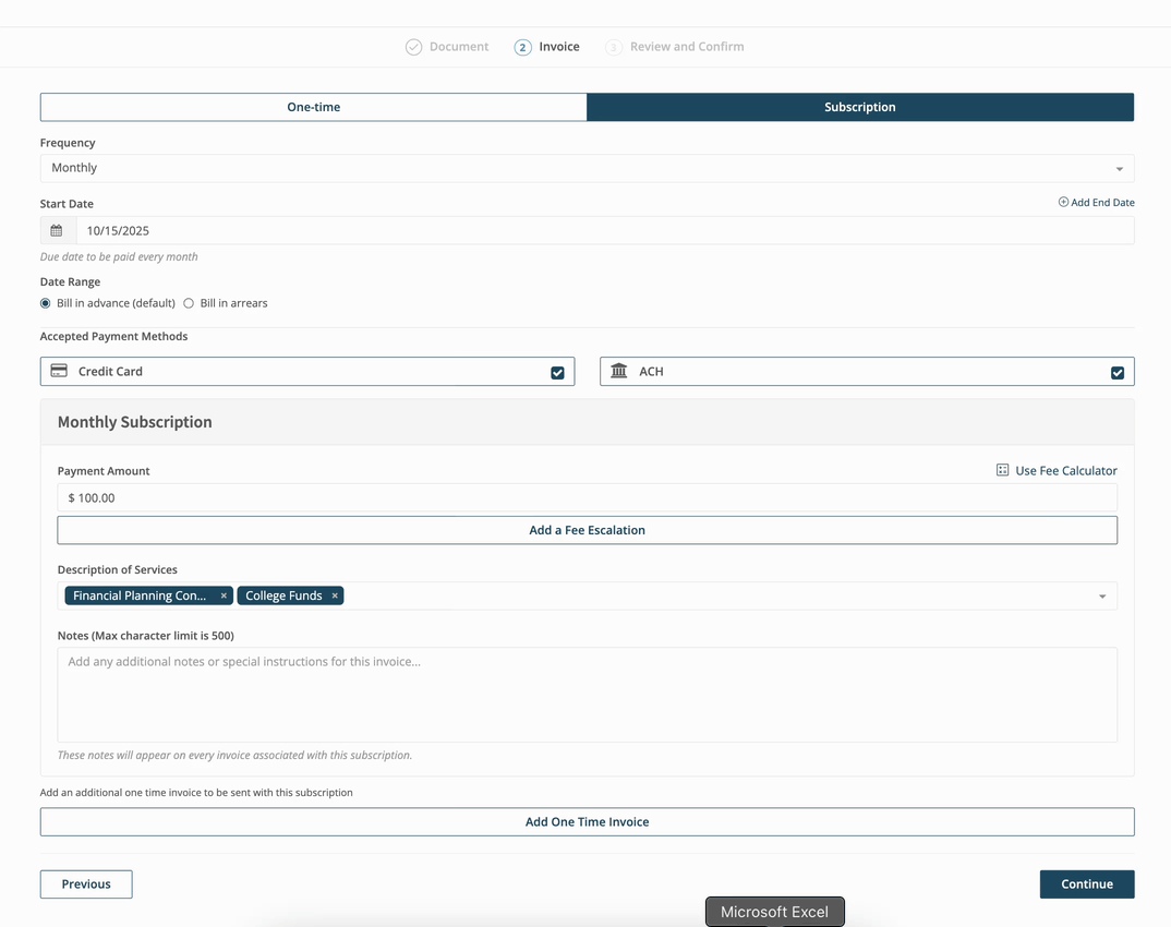Optional: If creating a subscription, you have the option to add an automatic future Fee Escalation.