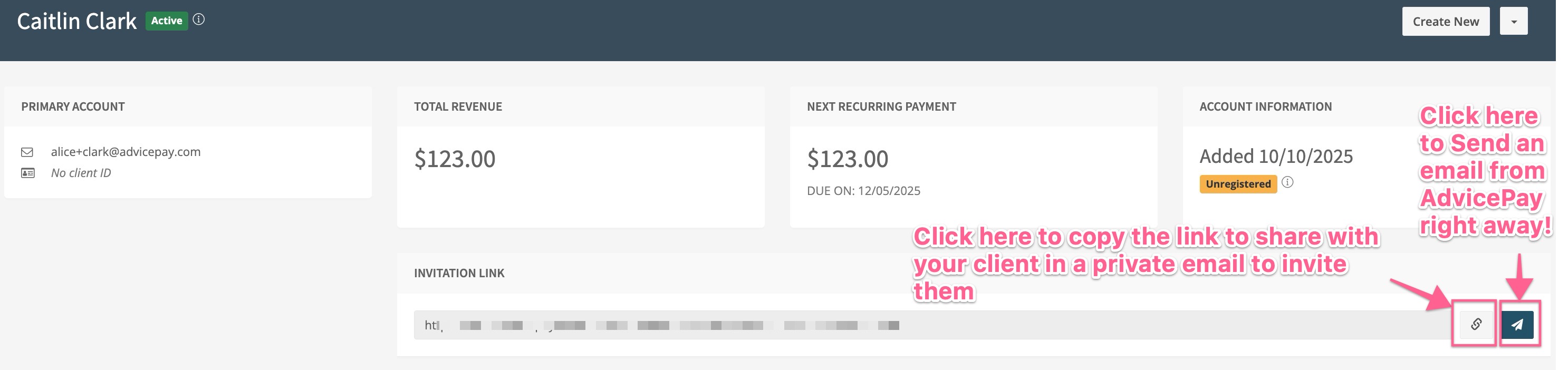 - It's optional, but you can send an invitation link if you prefer! This invites them to create an account with a password and lets them know you use AdvicePay with your firm. (these last 30 days once sent- if they don't register. The link will remain in view, and you can send a new one!)