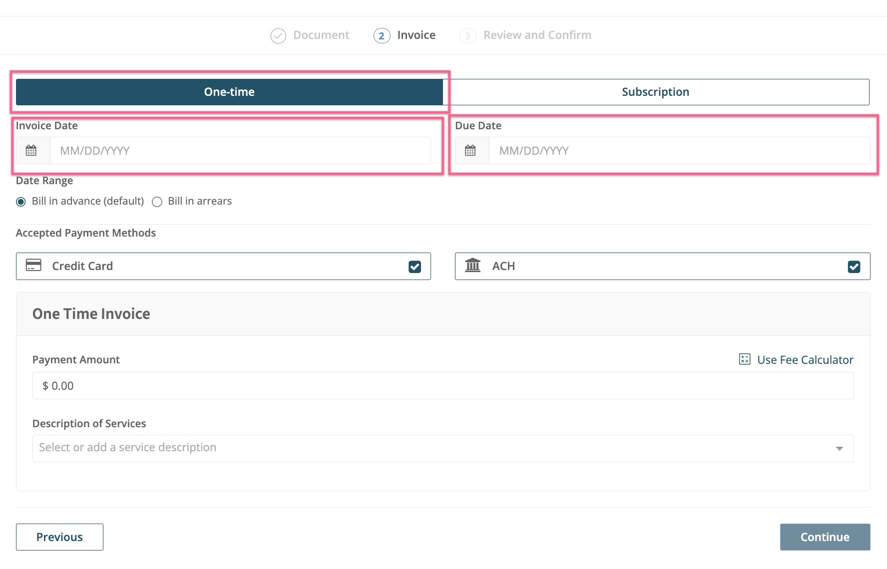 Important: The ability to schedule a future invoice or subscription is controlled by the Firm's Account Owner and may or may not be available.