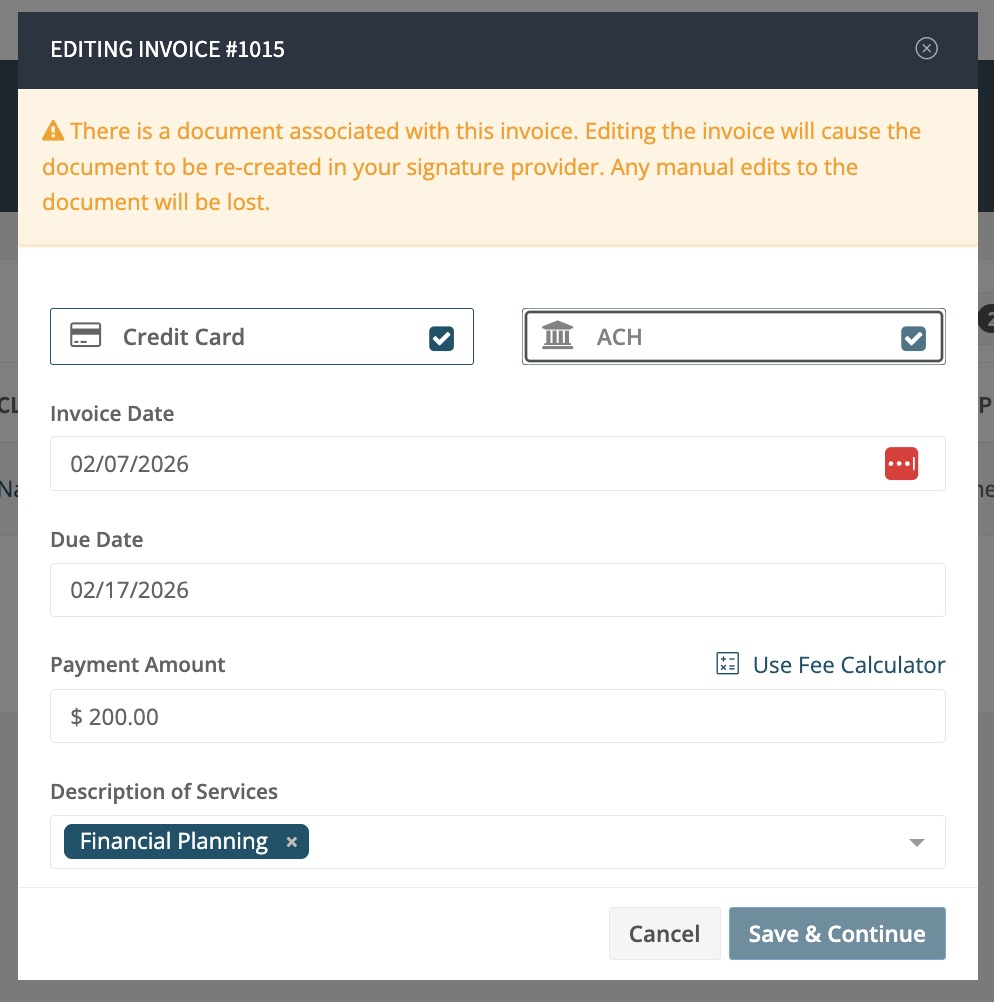 - If you have a document attached, editing the invoice will cause the document to be re-created in your signature provider. Any manual edits to the document will be lost due to this process. Please send the email or a reminder in the next modal after editing the invoice.